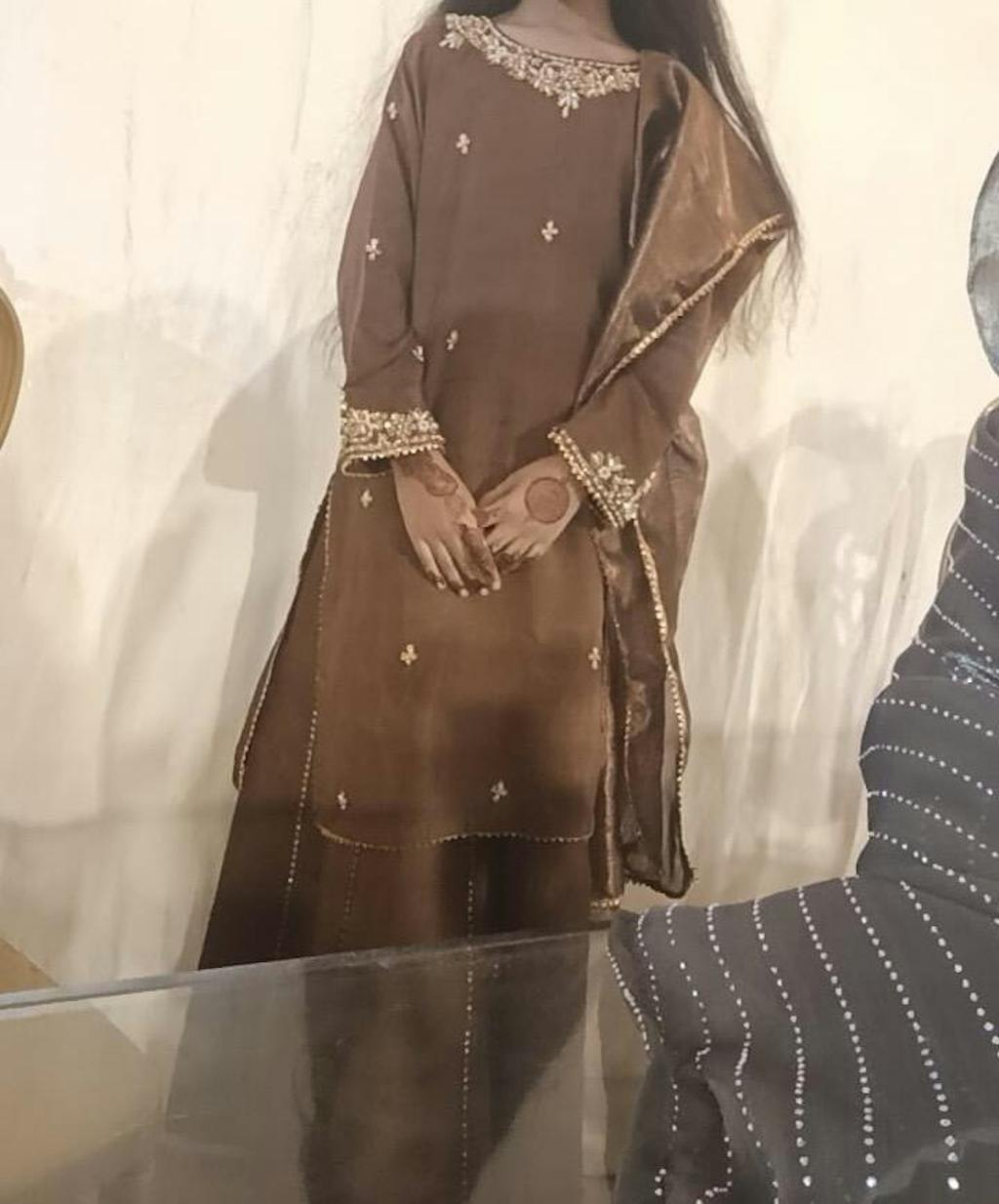 The kurta features delicate hand embellishments and fine thread embroidery around the neckline and sleeves, inspired by the shimmer of zircon stones — subtle yet captivating. The wide-leg sharara-style trousers complete the regal silhouette, offering comfort and a graceful flow.